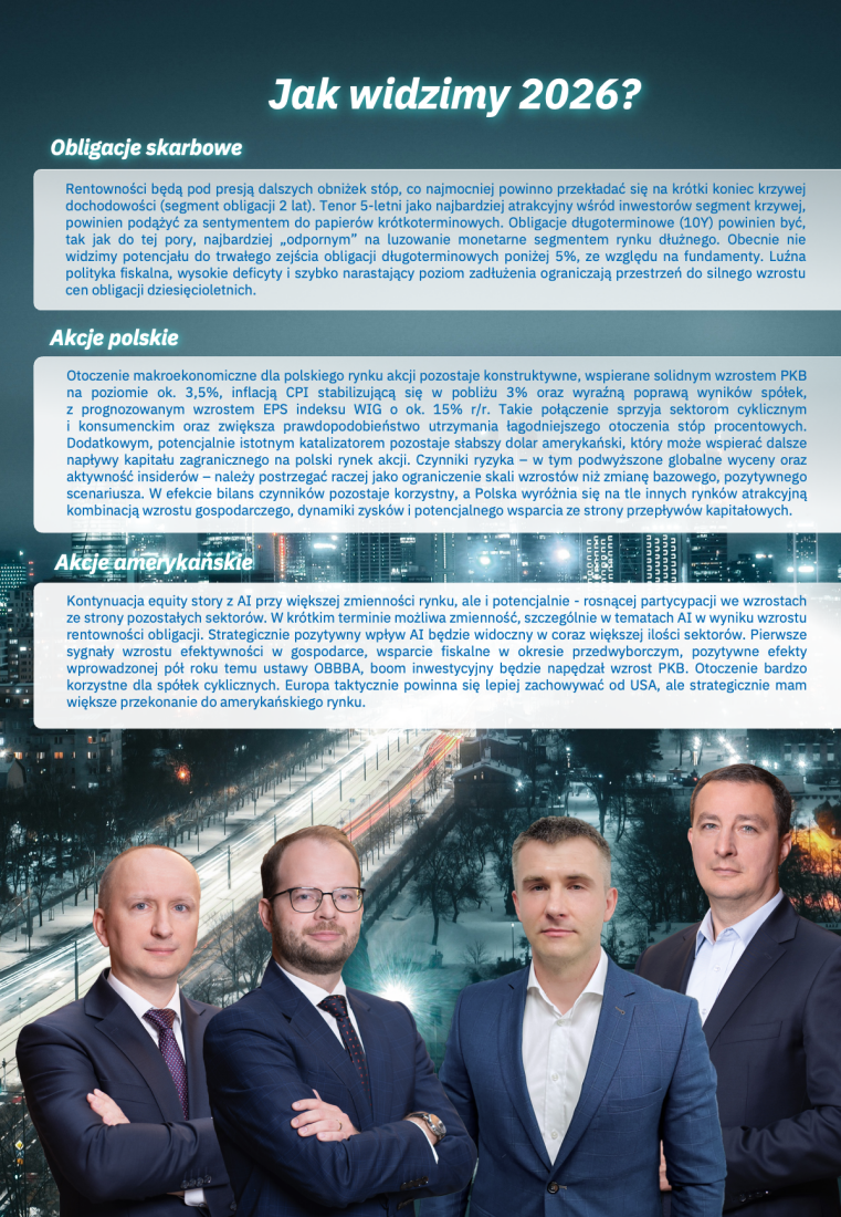 W niniejszym komentarzu przedstawiamy podsumowanie kluczowych wydarzeń 2025 roku oraz nasze spojrzenie na perspektywy rynkowe na 2026 rok. Na wstępie głos zabiera Michał Szymański, Prezes Zarządu VIG/C-QUADRAT TFI, a następnie Zarządzający funduszami dzielą się oceną perspektyw dla obligacji skarbowych oraz rynków akcji w Polsce i w Stanach Zjednoczonych.