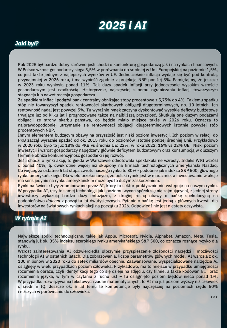 WięcejRok 2025 już za nami. W 2026 wchodzimy z silnym wzrostem gospodarczym, wyraźnym spowolnieniem inflacji oraz z wysoką dynamiką rynków akcji. Dodatkowym, globalnym czynnikiem kształtującym nastroje pozostaje dynamiczny rozwój technologii sztucznej inteligencji oraz niepokoje polityczne.